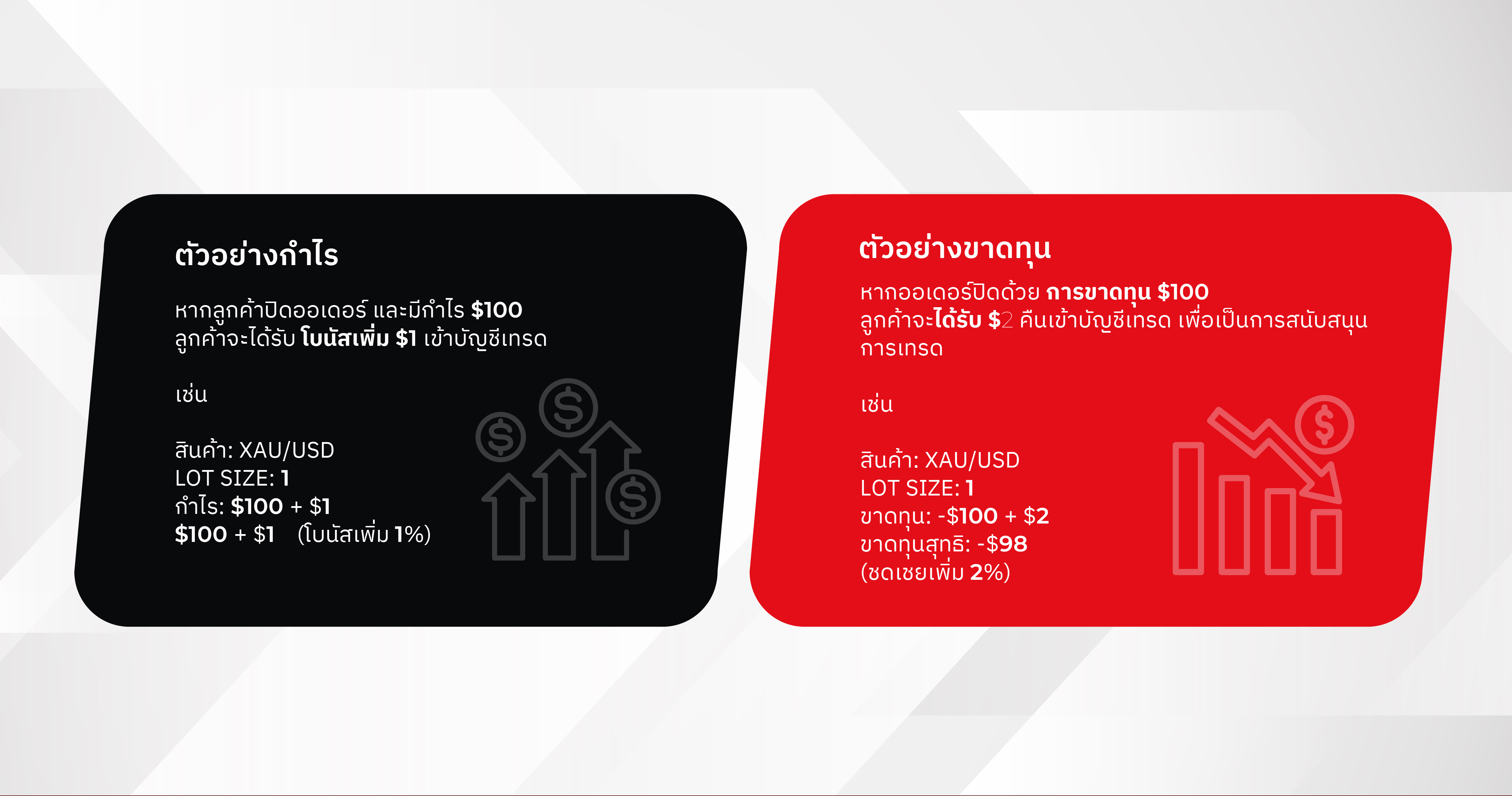 • ○ Trading Cashback 2% จากยอดขาดทุนสุทธิของออเดอร์ที่ปิดด้วยการขาดทุน